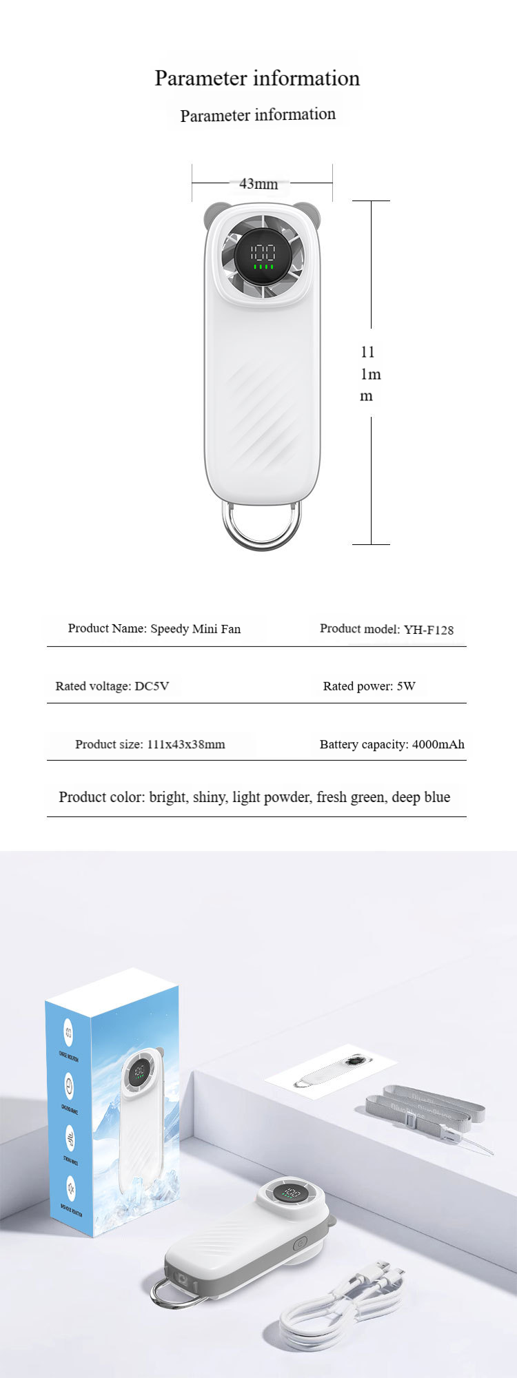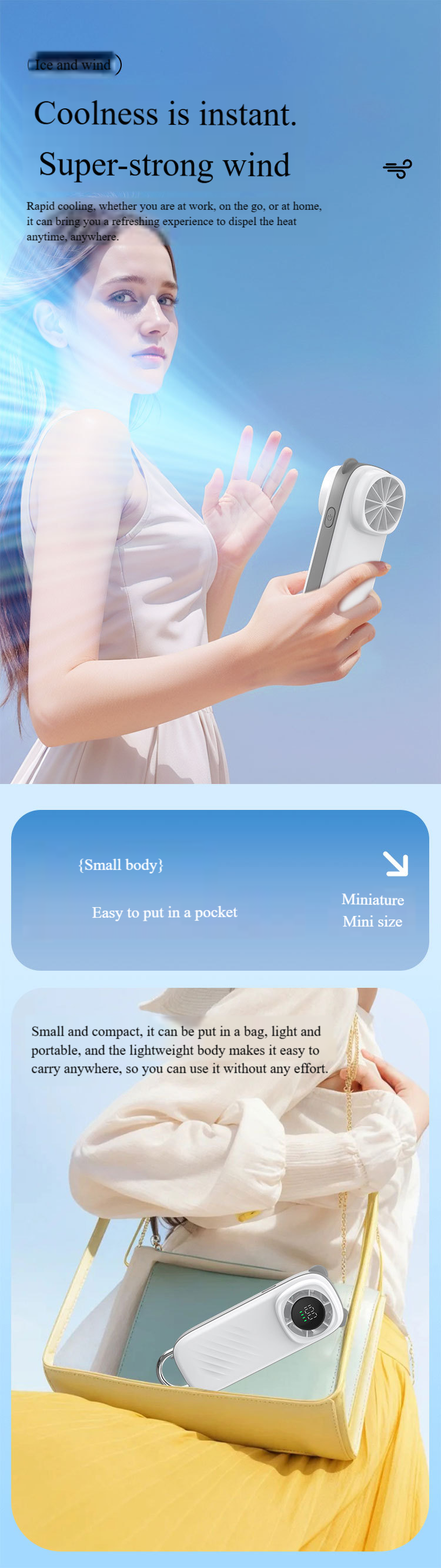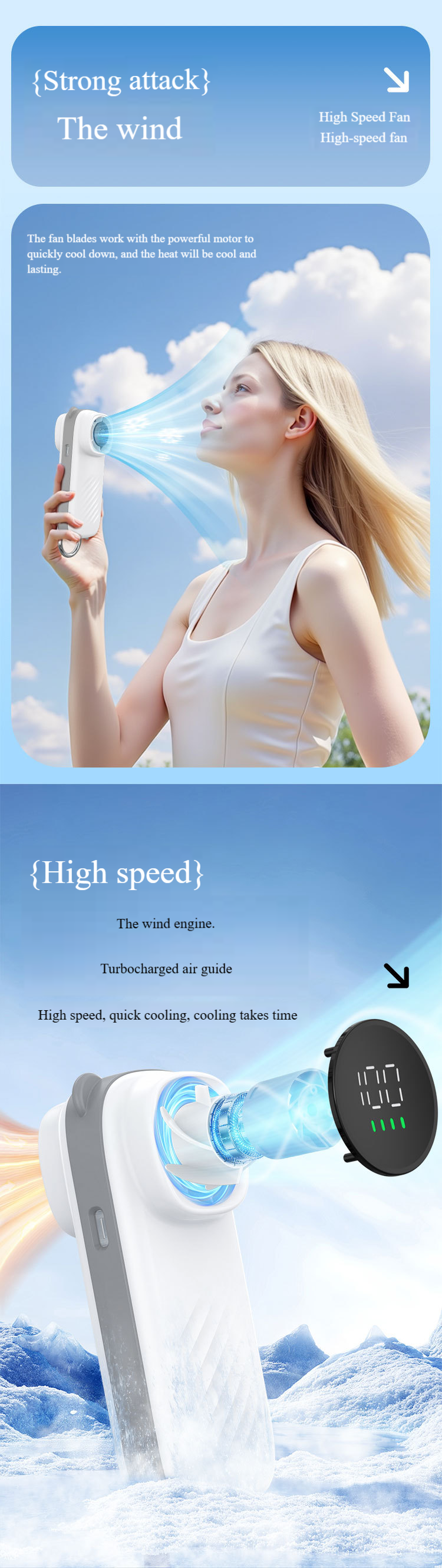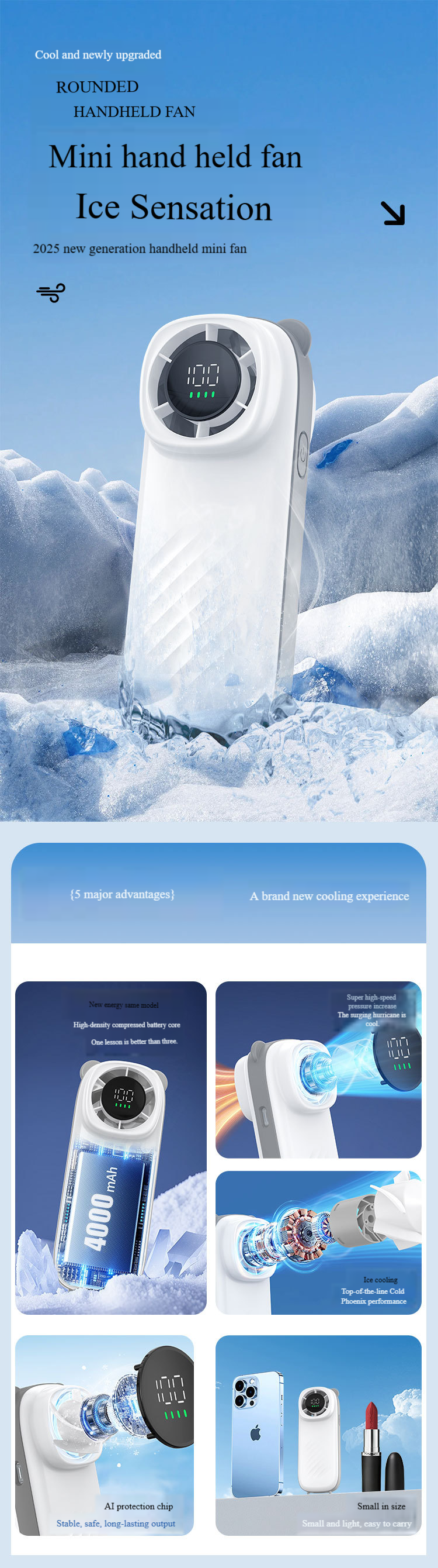 تتميز هذه المروحة اليدوية المصنوعة من مادة ABS بحجمها الصغير (111 × 43 × 38 مم) ووزنها الخفيف (121 غرامًا فقط)، مما يجعلها سهلة الحمل. مزودة ببطارية سعة 3000 مللي أمبير (103048-2P)، وتوفر وقت شحن 3.5 ساعات، ووقت تشغيل يتراوح بين 2.5 و7.5 ساعات. متوفرة بخمسة ألوان: الأبيض القمري، والوردي الخوخي، والأسود الداكن، والأخضر المنعش، والأزرق البحري العميق. تدعم المروحة 100 مستوى سرعة متدرج، وتتميز بسرعة دوران عالية تصل إلى 190000 دورة في الدقيقة.