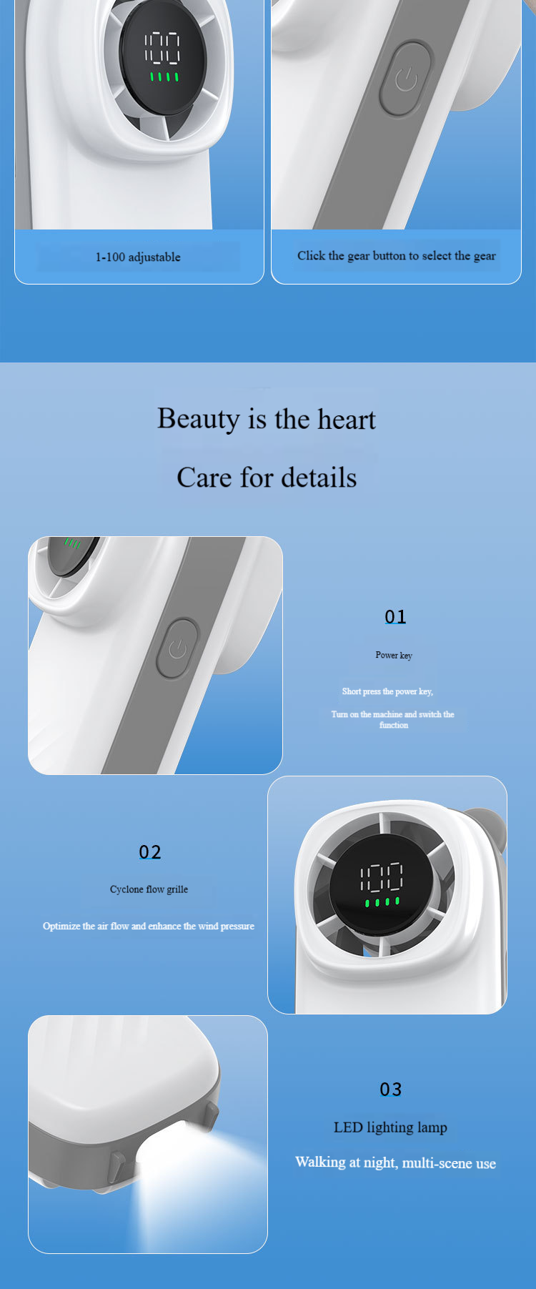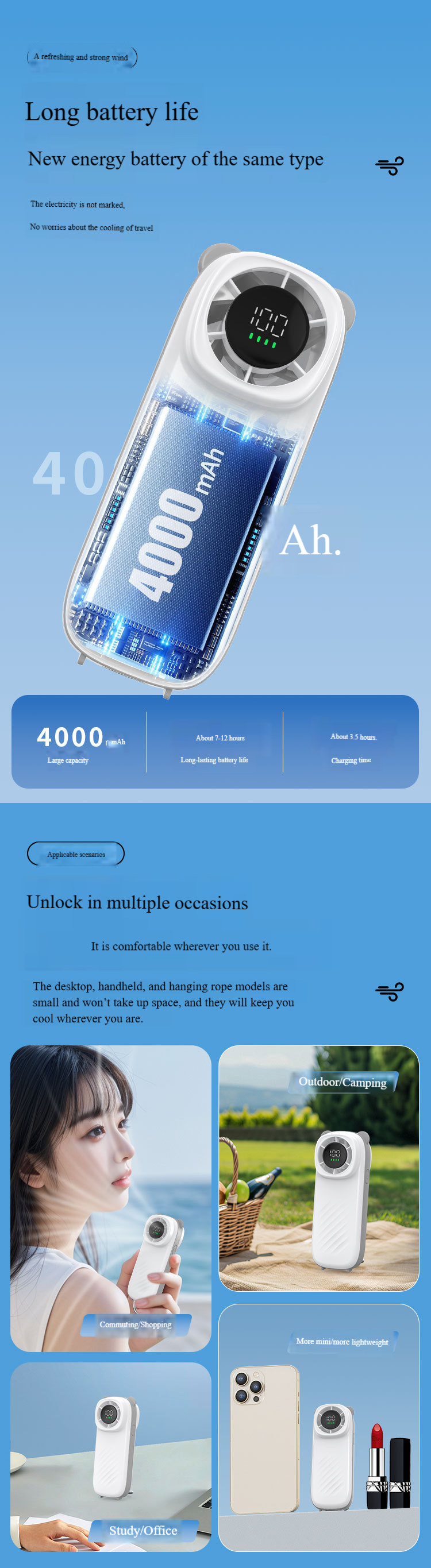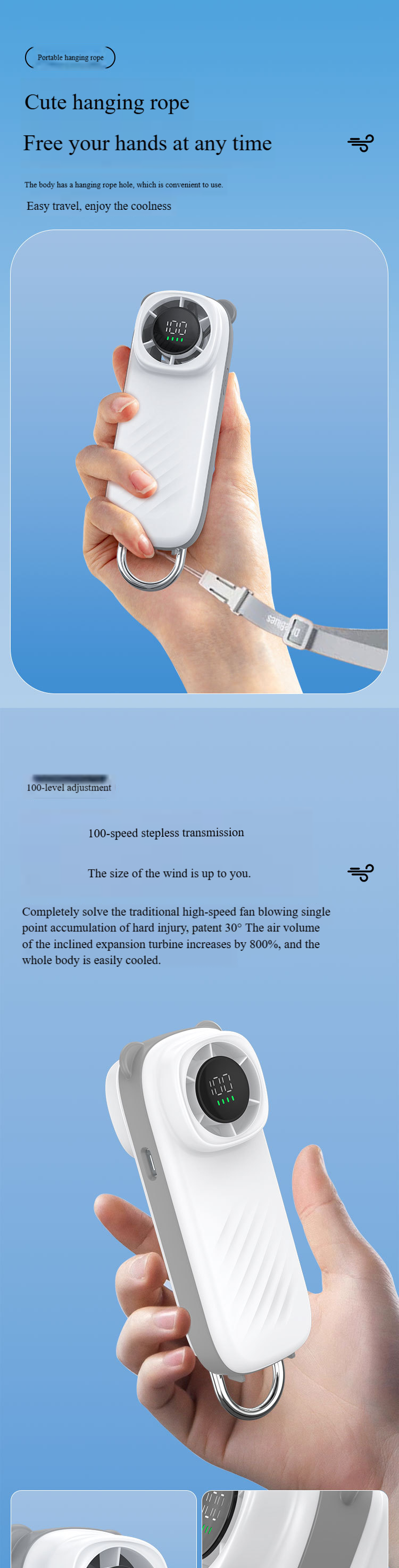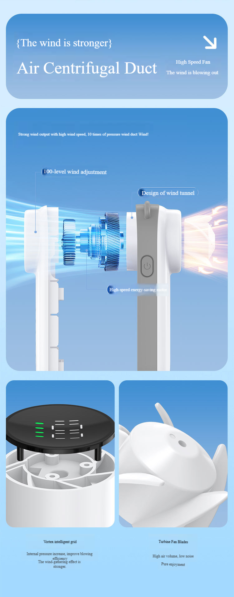 تتميز هذه المروحة اليدوية المصنوعة من مادة ABS بحجمها الصغير (111 × 43 × 38 مم) ووزنها الخفيف (121 غرامًا فقط)، مما يجعلها سهلة الحمل. مزودة ببطارية سعة 3000 مللي أمبير (103048-2P)، وتوفر وقت شحن 3.5 ساعات، ووقت تشغيل يتراوح بين 2.5 و7.5 ساعات. متوفرة بخمسة ألوان: الأبيض القمري، والوردي الخوخي، والأسود الداكن، والأخضر المنعش، والأزرق البحري العميق. تدعم المروحة 100 مستوى سرعة متدرج، وتتميز بسرعة دوران عالية تصل إلى 190000 دورة في الدقيقة.